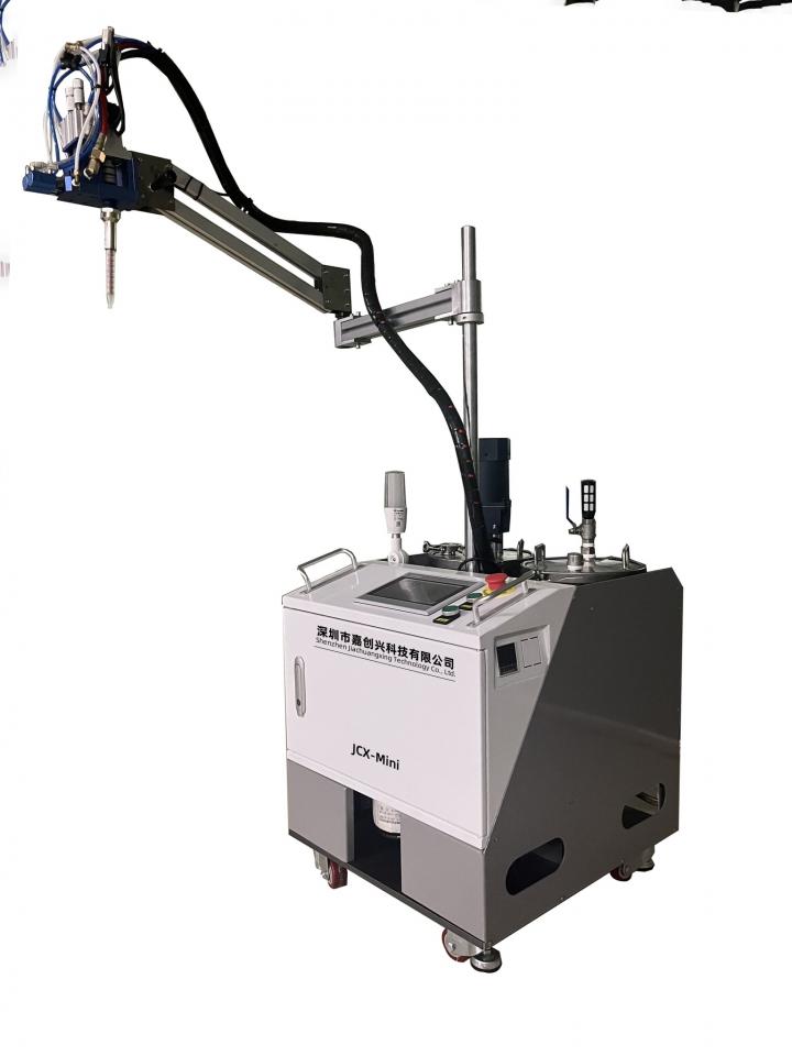1. 料缸均配有低液位传感器,缺料自动报警,机器有低气压 及过载保护中文故障输出; 2. 静态或动态混合器强制搅拌方式,使混合效果更加均匀; 3. 比例调节触摸弹指间,让操作者轻松调整所需比例; 4. 吐出速度、吐出量皆可设定,吐胶量稳定不滴不漏; 5. 多种选配功能,适应不同的灌胶工艺需求; 6. 本机型可搭配任意行程机械手及SCARA多关节机器人进行 作业,亦可离线单独手持式操作,真正达到一机多用。